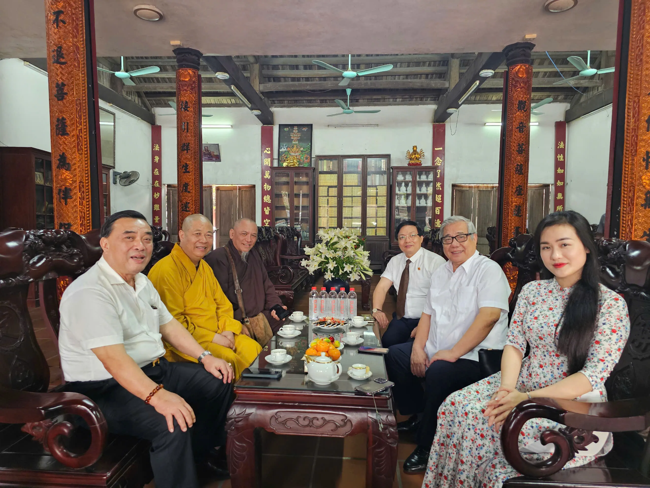 Hòa thượng, TS. Thích Thọ Lạc, Trưởng ban Văn hóa Trung ương Giáo hội Phật giáo Việt Nam đón tiếp Giáo sư, Tiến sĩ khoa học, Nhà giáo nhân dân Vũ Minh Giang – Chủ tịch hội đồng dòng họ Vũ Võ Việt Nam, Chủ tịch Hội đồng Khoa học và Đào tạo Đại học Quốc gia Hà Nội, Phó Chủ tịch Hội Khoa học Lịch sử Việt Nam và đoàn đại biểu dòng họ Vũ Võ Việt Nam sáng 19/4/2025 tại chùa Đậu (Thành đạo tự)
