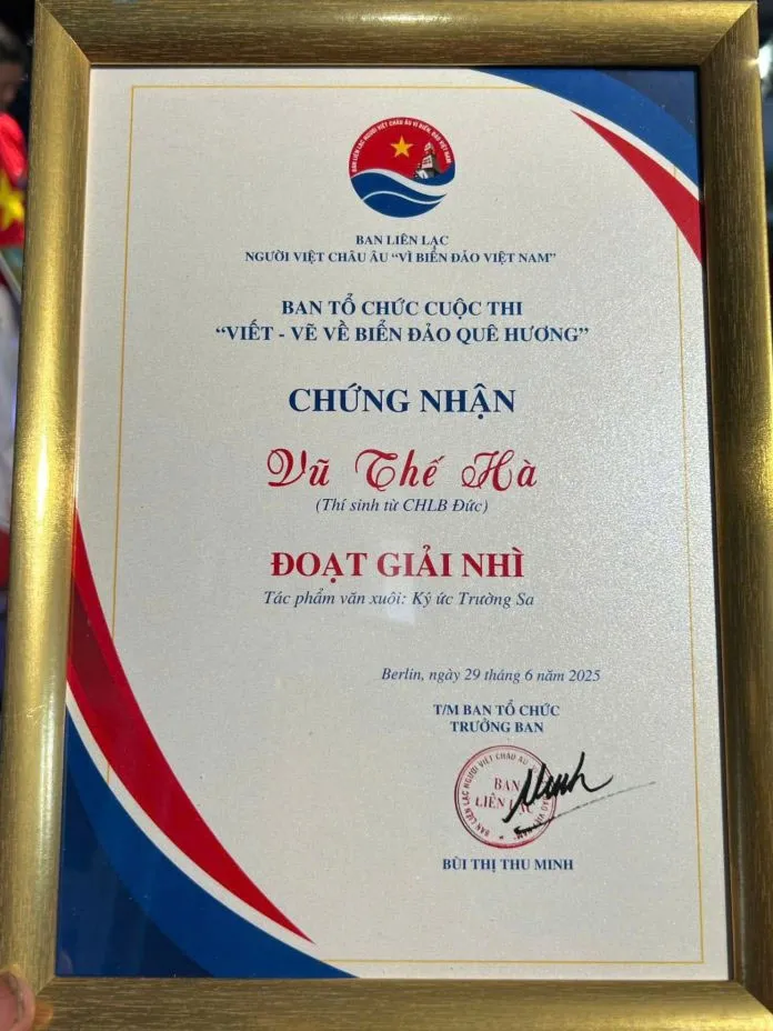 Chiều 29/6/2025, tại CHLB Đức, Câu lạc bộ Trường Sa Châu Âu đã tổ chức lễ trao giải cuộc thi “Viết – vẽ về biển đảo quê hương”, với sự tham dự và chứng kiến của nhiều khách mời danh dự và đại diện cộng đồng người Việt tại châu Âu.
