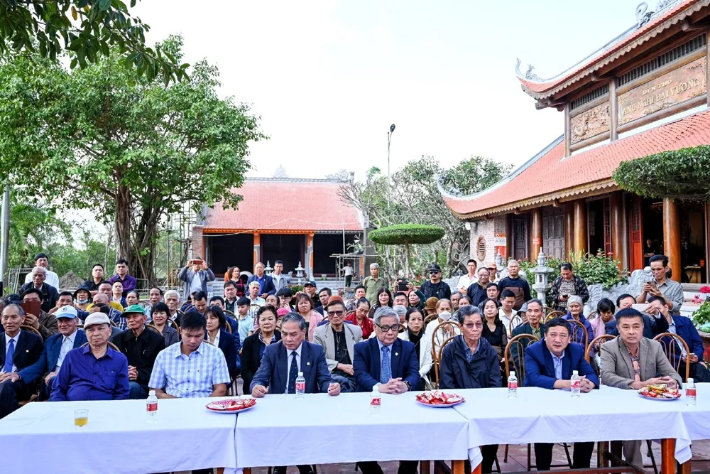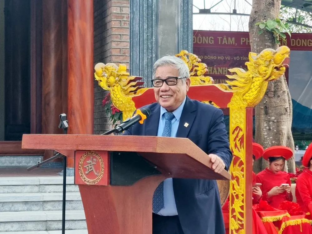 Giáo sư, Tiến sỹ khoa học, NGND Vũ Minh Giang phát biểu tại Lễ khánh thành giai đoạn II đền thờ Tiến sỹ Vũ Phi Hổ, biểu dương công trình tiêu biểu về quy trình đầu tư trùng tu, xây dựng Di tích văn hóa-lịch sử.