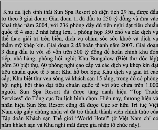 Trong những năm qua, Trường Thịnh luôn là doanh nghiệp dẫn đầu của tỉnh Quảng Bình. Khu du lịch mang tên Sun Spa Resort đã qua 2 giai đoạn đầu tư với số vốn hơn 1.000 tỷ đồng, đảm bảo cho hàng ngàn du khách dừng chân trên bán đảo Bảo Ninh thơ mộng với hệ thống dịch vụ hoàn hảo đạt tiêu chuẩn quốc tế 4- 5 sao. Giai đoạn 3 đang được đầu tư với khu biệt thự ven sông và khách sạn 15 tầng, trong đó có phòng hội nghị, hội thảo đạt tiêu chuẩn quốc tế với sức chứa trên 1.000 người.