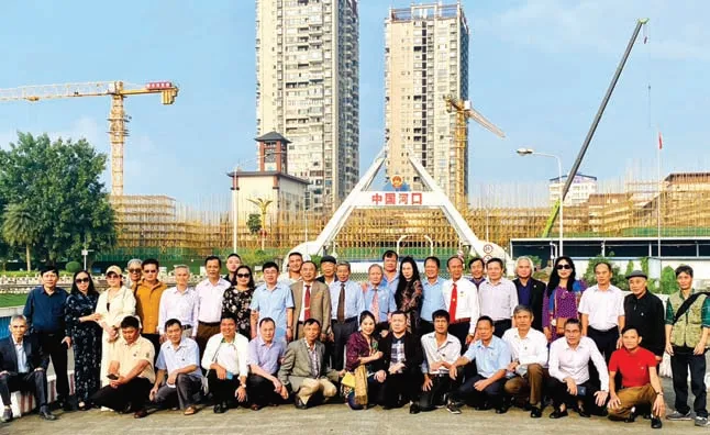 Các đại biểu dự gặp mặt giao lưu tham quan và chụp ảnh tại cửa khẩu Lào Cai.