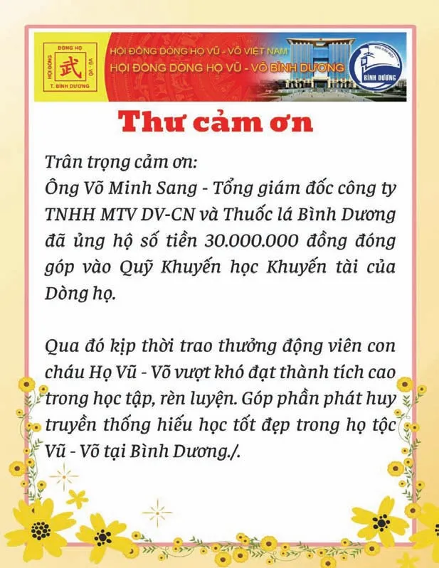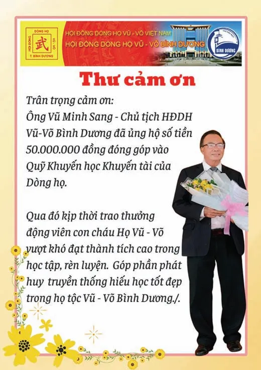 Điều đáng phấn khởi là ngay sau khi thành lập Ban Thi đua – Khen thưởng Khuyến học Khuyến tài (KHKT) gồm 5 thành viên do ông Võ Thành Nhâm – Ủy viên BTV HĐDH Vũ – Võ tỉnh Bình Dương làm Trưởng ban, Quỹ KHKT đã nhận được sự ủng hộ đóng góp với số tiền 100.000.000 đồng của các vị: Ông Vũ Minh Sang – Phó Chủ tịch HĐDH Vũ – Võ Việt Nam – Chủ tịch HĐDH Vũ – Võ Bình Dương; Giáo sư, Tiến sĩ Võ Minh Đức – Phó Chủ tịch TT HĐDH Vũ – Võ tỉnh Bình Dương; ông Võ Minh Sang – Tổng Giám đốc Công ty TNHH MTV Dịch vụ, Công nghiệp và Thuốc lá Bình Dương.