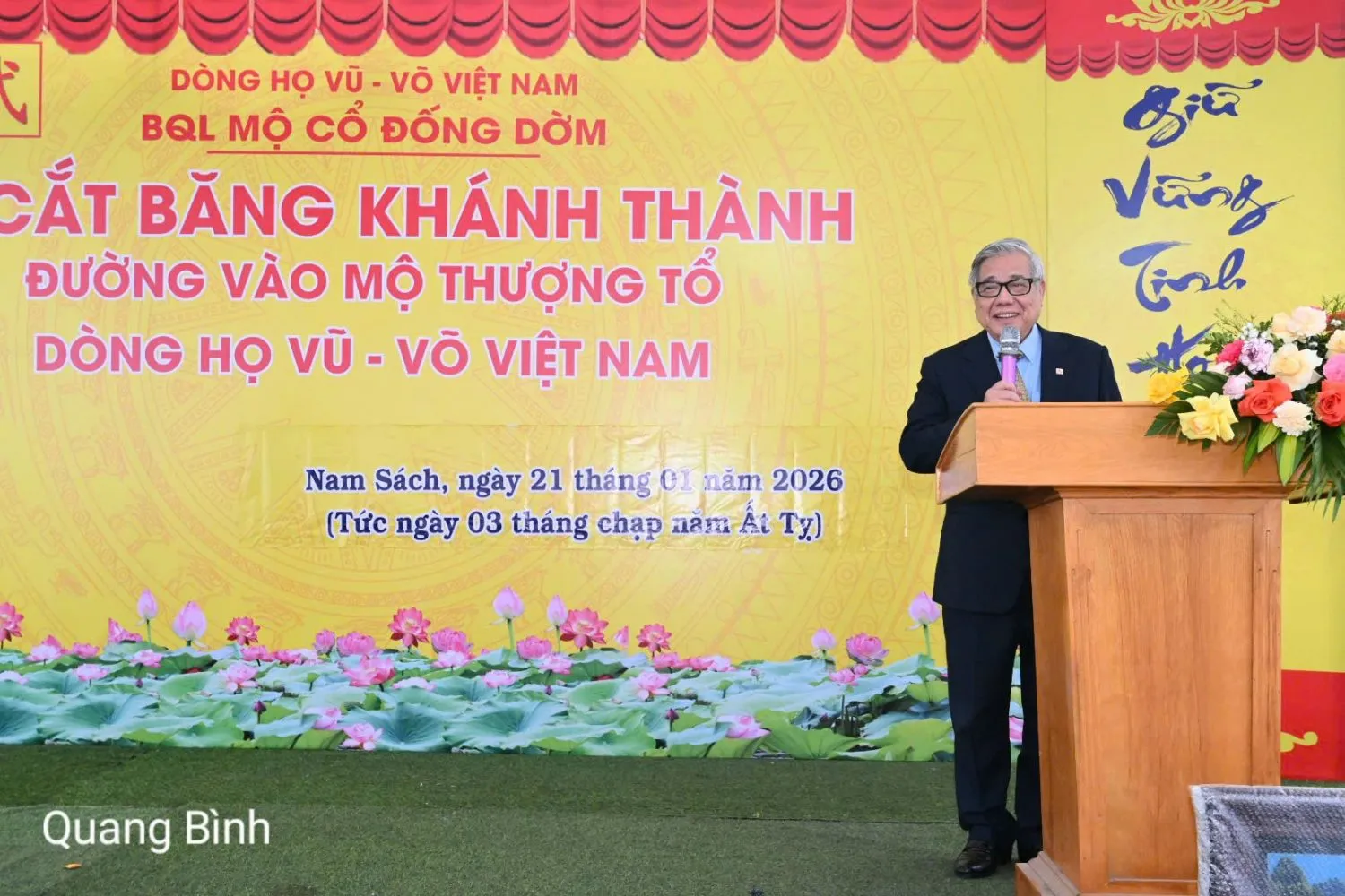 Việc hoàn thành con đường vào khu linh tích hôm nay không chỉ là ước nguyện bao đời của dòng họ, mà còn hòa chung với ước nguyện của dân tộc trong việc gìn giữ, tôn vinh cội nguồn và sự học. Ông trân trọng cảm ơn cái tâm trong sáng, bền bỉ của những người con dòng họ Vũ – Võ đã lặng thầm góp sức dựng xây, đồng thời cảm ơn sự quan tâm, tạo điều kiện của chính quyền và nhân dân địa phương để khu linh tích Đống Dờm ngày càng khang trang, xứng đáng là miền thiêng của tri ân và khai mở.