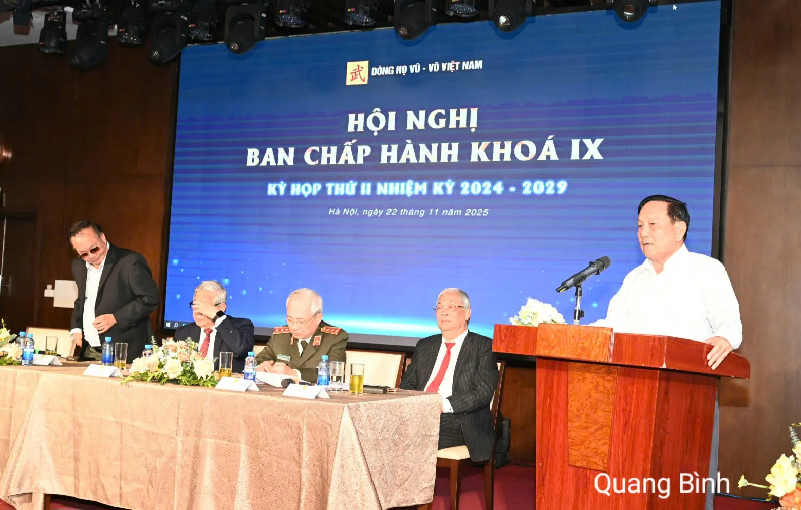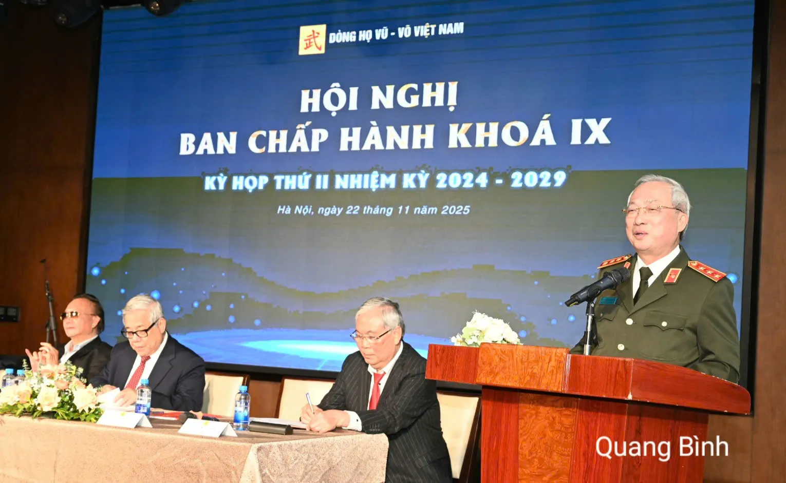 Trung tướng Vũ Thuật – Tân Phó Chủ tịch HĐDH Vũ – Võ Việt Nam đọc báo cáo tại hội nghị