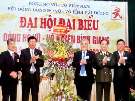 President of the Vu – Vo Clan Council of Vietnam, Vu Minh Giang, and President of the Vu – Vo Clan Council of Hai Duong Province, Vu Dinh Thuat, presented flowers to congratulate the Representative Congress of the Vu – Vo Clan of Binh Giang District.