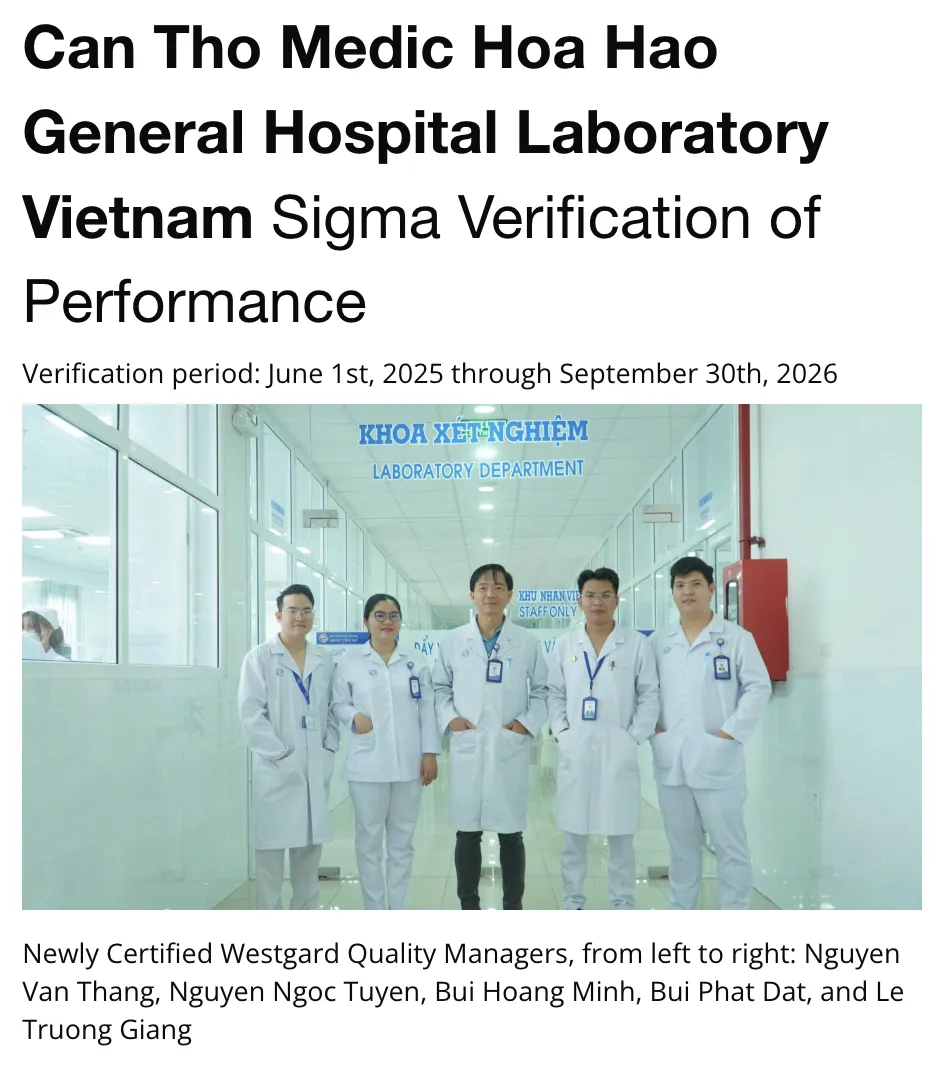 Tổ chức Westgard QC (Hoa Kỳ) cấp Giấy chứng nhận hoàn thành Chương trình Sigma Verification of Performance