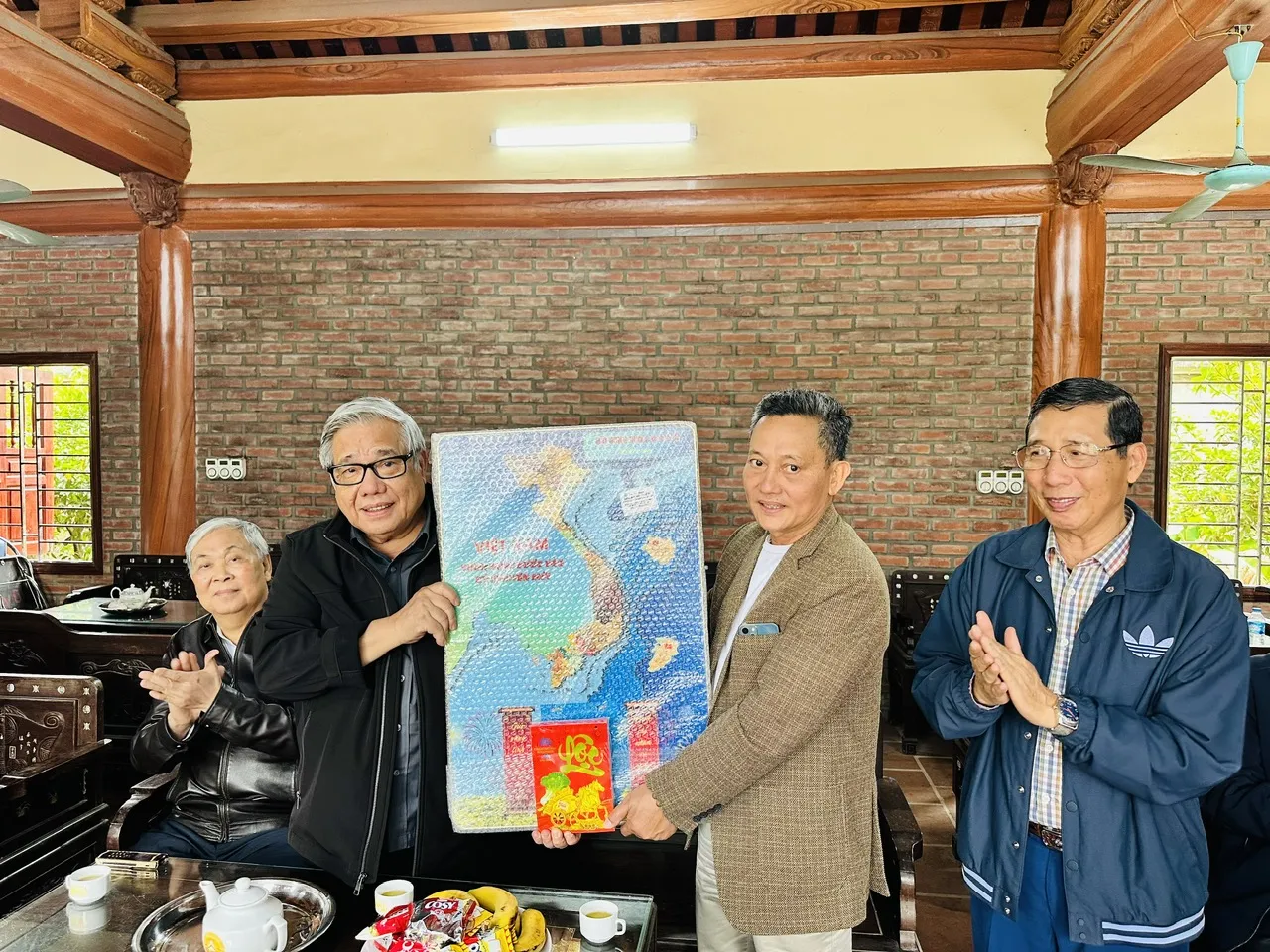 Chủ tịch HĐDH Vũ – Võ Việt Nam – GS.TSKH.NGND Vũ Minh Giang tặng quà cho doanh nhân Vũ Thùy Hương, người sẽ làm tiếp và hoàn thiện con đường.