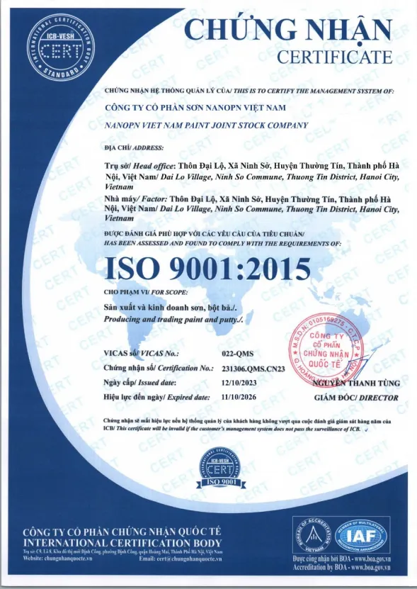 Giấy chứng nhận ISO 9001:2015 của Công ty CP Sơn NANOPN Việt Nam.