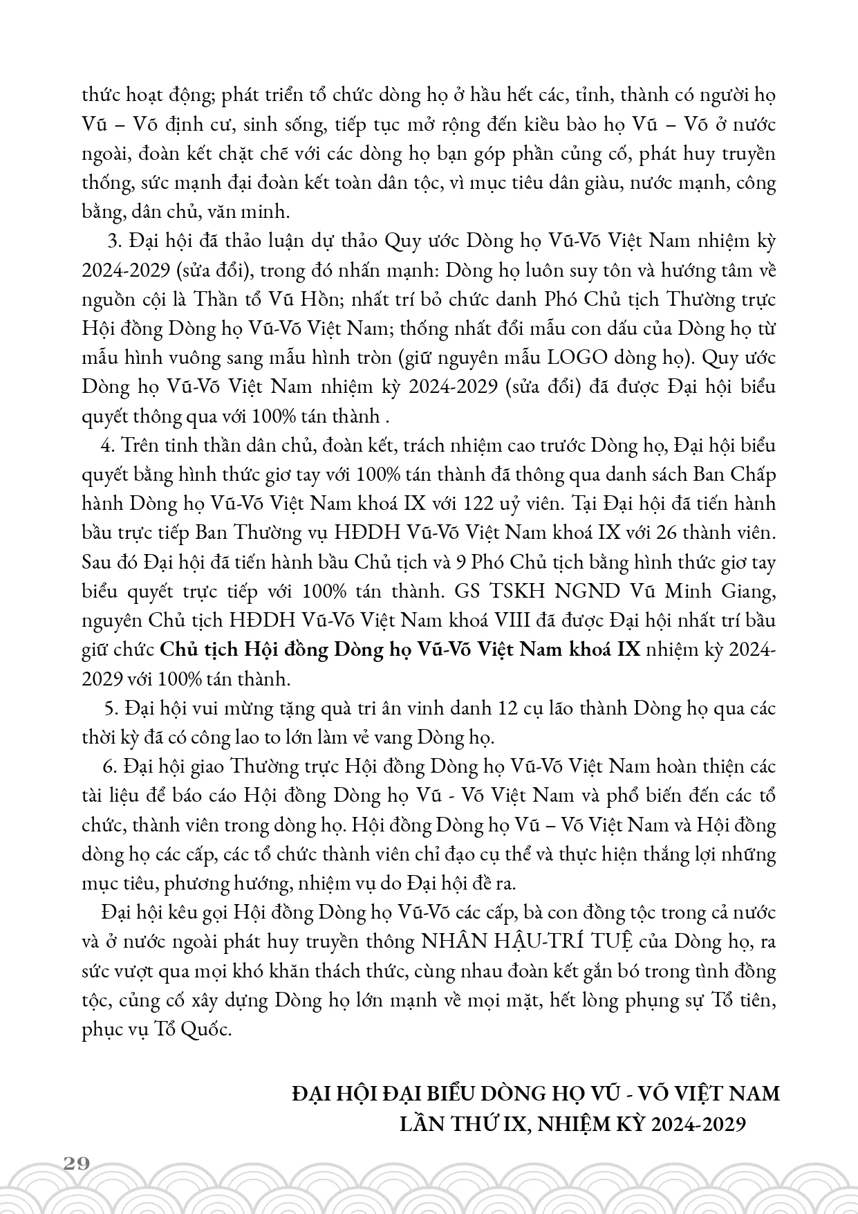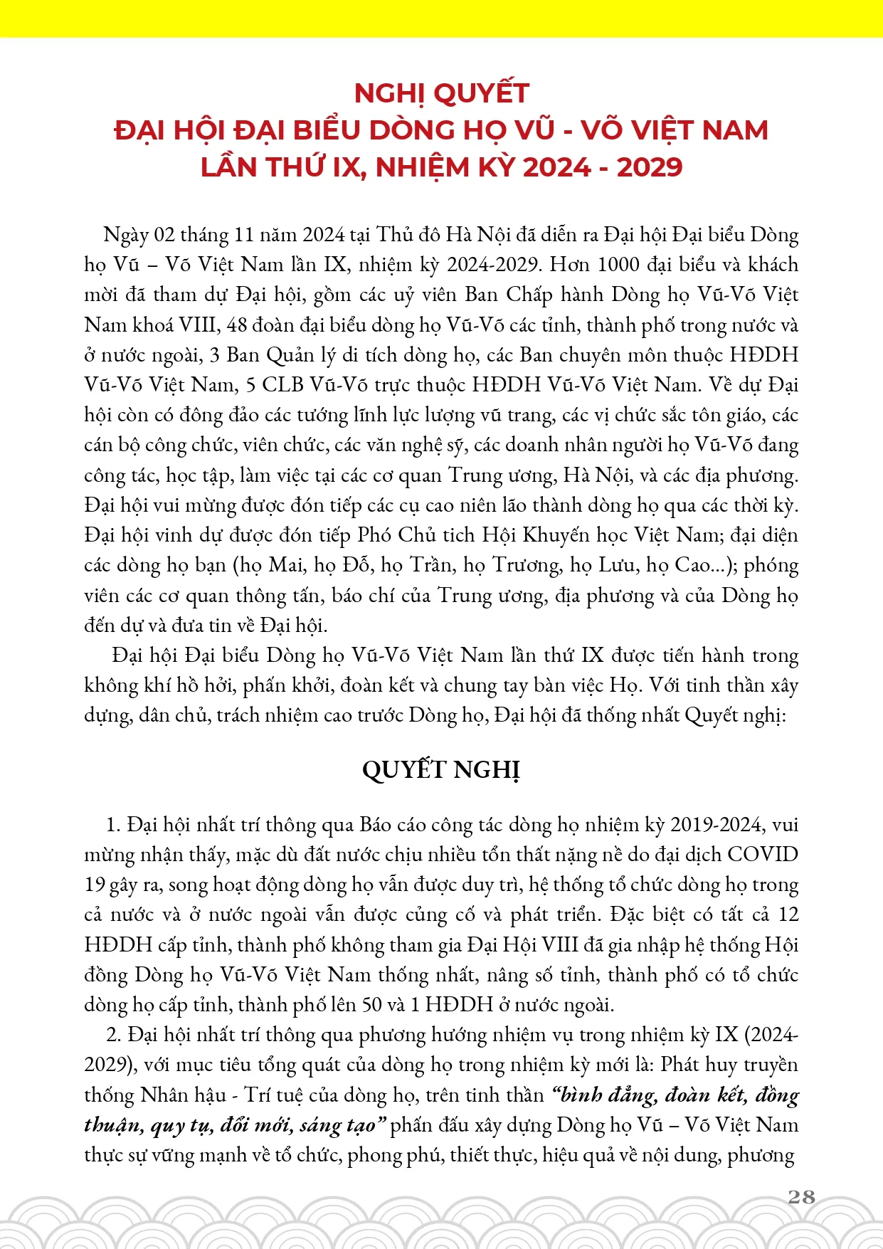 Dưới đây là: Nghị quyết đại hội đại biểu dòng họ Vũ - Võ Việt Nam lần thứ IX, nhiệm kỳ 2024 - 2029.