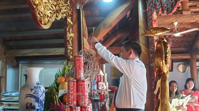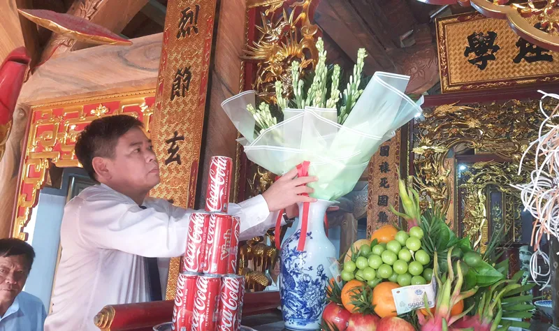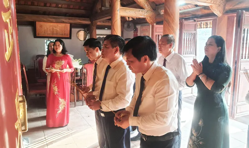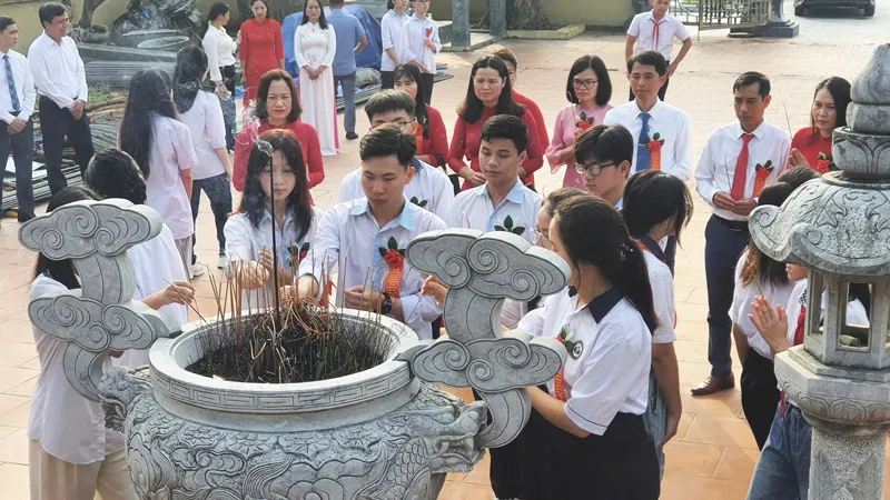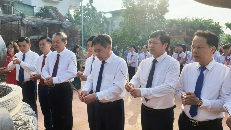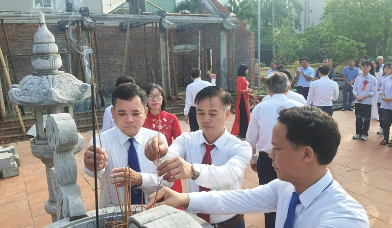 Các đại biểu, các thầy cô giáo và các em học sinh dâng hương tại Đền thờ Trạng nguyên Vũ Duệ