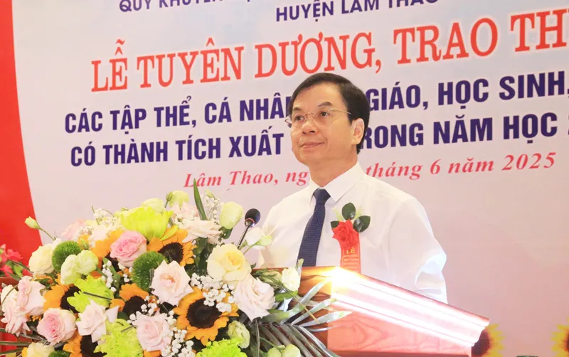 Phát biểu khai mạc buổi lễ, đồng chí Khuất Đăng Khoa – Phó Bí thư Huyện ủy, Chủ tịch UBND huyện, Chủ tịch Hội đồng quản lý Quỹ nhấn mạnh: Truyền thống hiếu học, tôn sư trọng đạo là nét đẹp văn hóa lâu đời của dân tộc ta, đặc biệt được gìn giữ và phát huy tại mảnh đất Lâm Thao – quê hương của Trạng nguyên Vũ Duệ. Tiếp nối truyền thống quý báu ấy, Quỹ Khuyến học, Khuyến tài Trạng nguyên Vũ Duệ huyện Lâm Thao đã được thành lập và hoạt động hiệu quả trong 3 năm qua, trở thành một điểm tựa tin cậy, khích lệ hàng ngàn lượt học sinh, sinh viên vượt khó vươn lên trong học tập và tỏa sáng trên hành trình tri thức. Năm học 2024–2025, dù còn nhiều khó khăn, thử thách, nhưng với tinh thần trách nhiệm cao, đội ngũ thầy cô giáo và các em học sinh, sinh viên trong toàn huyện đã nỗ lực không ngừng, đạt được nhiều thành tích đáng tự hào: xếp thứ nhất toàn tỉnh trong kỳ thi khảo sát học sinh lớp 9; xếp thứ hai toàn tỉnh trong kỳ thi chọn học sinh giỏi lớp 9 cấp tỉnh; cùng rất nhiều giải thưởng cao trong kỳ thi học sinh giỏi, các cuộc thi nghiên cứu khoa học, kỹ năng nghề nghiệp, các tấm gương sáng về nghị lực vươn lên trong học tập và rèn luyện đạo đức…Cơ sở vật chất trường lớp được đầu tư theo hướng đồng bộ, hiện đại, với gần 70% trường học đạt chuẩn quốc gia mức độ 2…