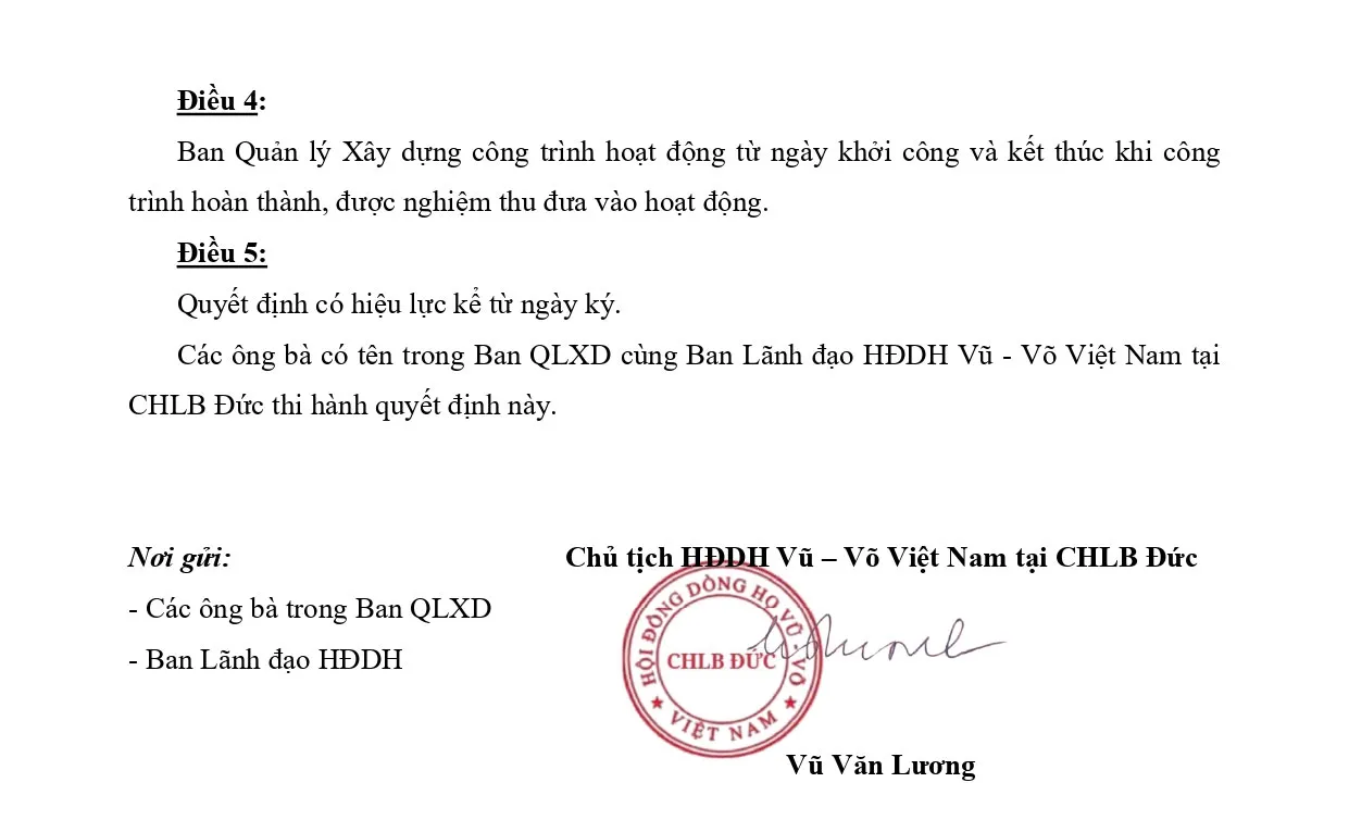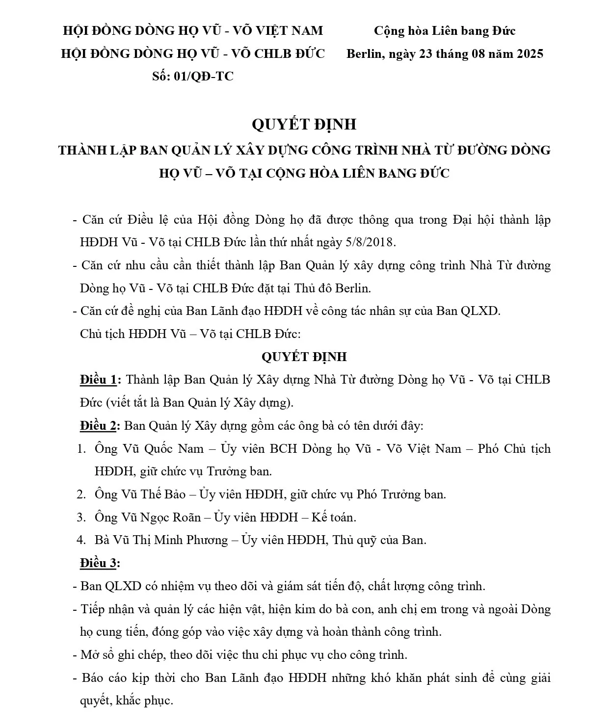 Dưới đây là: Quyết định thành lập ban quản lý xây dựng công trình nhà từ đường dòng họ Vũ - Võ tại cộng hòa Liên Bang Đức.