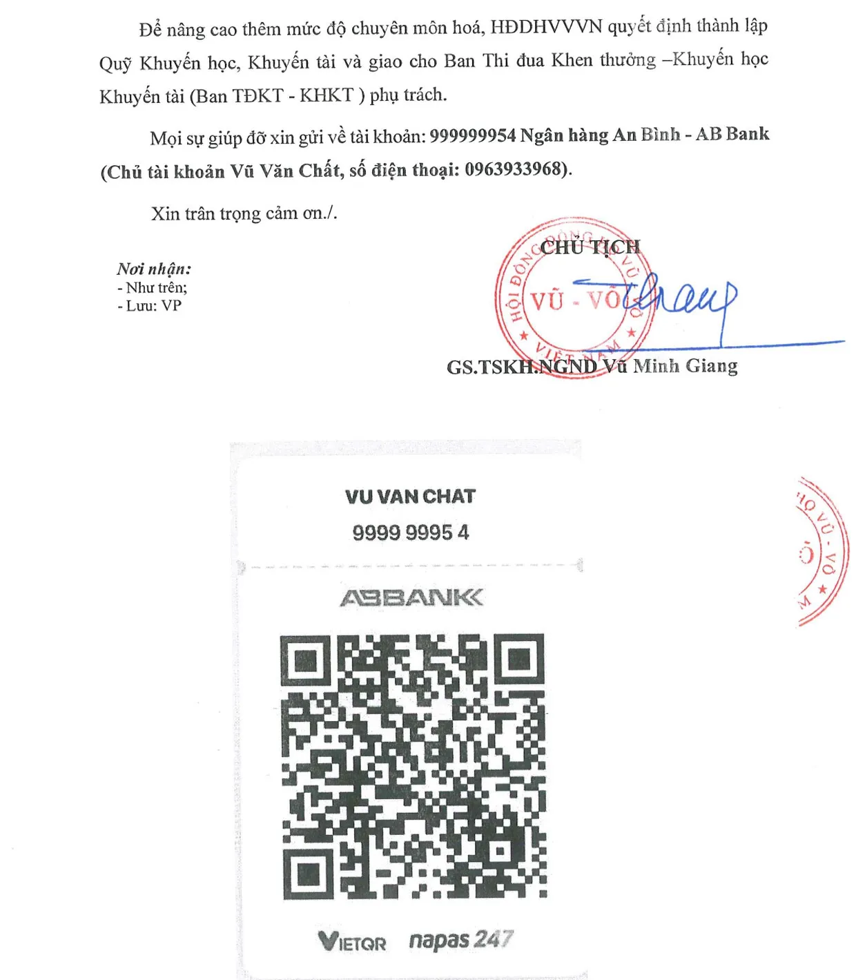 Chủ tài khoản: Đại tá, TS. Vũ Văn Chất – Phó Trưởng Ban Thi đua Khen thưởng – Khuyến học Khuyến tài HĐDH Vũ – Võ Việt Nam.