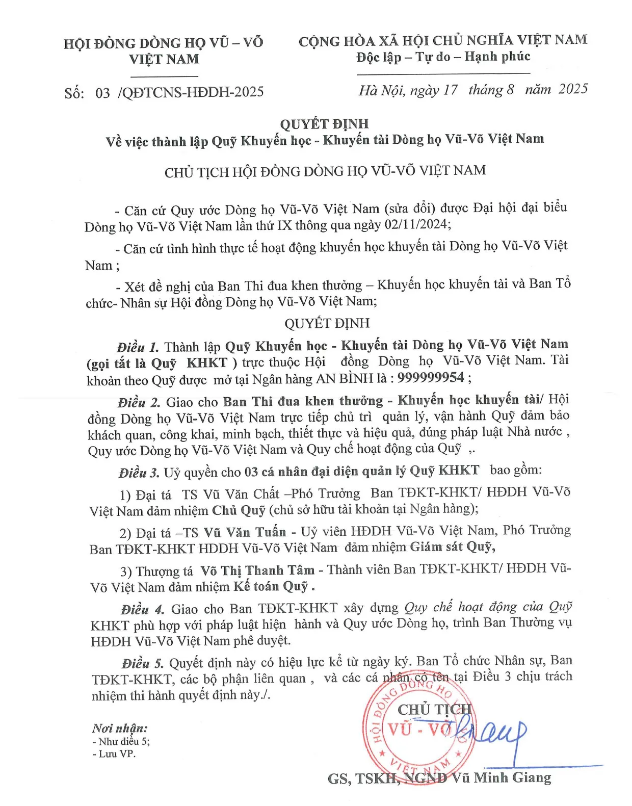 Thực hiện chỉ đạo của Chủ tịch HĐDH Vũ – Võ Việt Nam – GS.TSKH.NGND Vũ Minh Giang, HĐDH Vũ – Võ Việt Nam quyết định thành lập Quỹ Khuyến học – Khuyến tài Dòng họ Vũ – Võ Việt Nam. Quỹ nhằm động viên, hỗ trợ, tiếp sức cho các cháu học sinh, sinh viên, nhà khoa học trẻ của dòng họ, góp phần bồi dưỡng nguồn nhân lực chất lượng cho quê hương, đất nước.