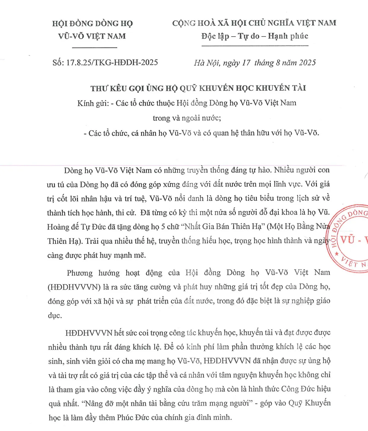 Để Quỹ sớm đi vào hoạt động, Ban Thi đua Khen thưởng – Khuyến học Khuyến tài trân trọng kêu gọi bà con đồng tộc Vũ – Võ và bè bạn thân thiết cùng chung tay ủng hộ Quỹ.