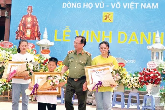 Thượng tướng Vũ Văn Thành – Thứ trưởng Bộ Công an tặng Bằng Vũ tộc tinh hoa cho các cháu đạt thành tích cao.