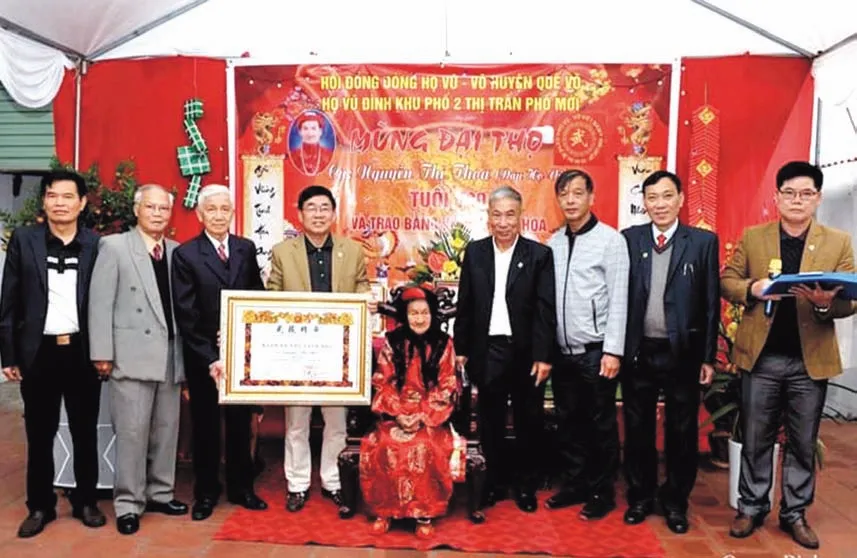 Hai ông Võ Văn Thành và Vũ Văn Dũng – Phó Chủ tịch HĐDH Vũ – Võ Việt Nam trao bằng Đại thọ cho cụ Phạm Thị Hồng (dâu họ Vũ) tuổi 90 tại Nam Định, mẹ ông Vũ Ngọc Oánh – Phó Chủ tịch HĐDH Vũ – Võ tỉnh Bắc Ninh.