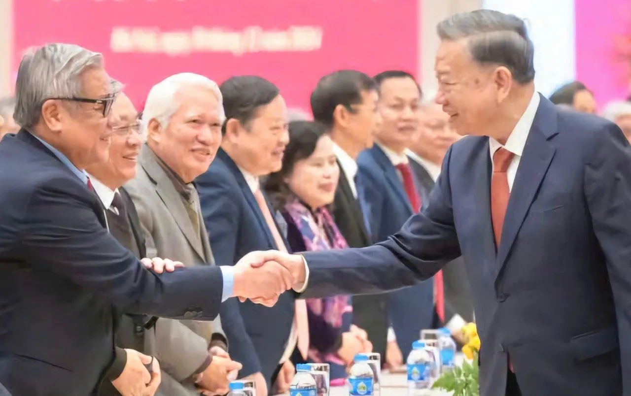 Tổng Bí thư Tô Lâm bắt tay GS-TSKH -NGND Vũ Minh Giang tại buổi gặp mặt trí thức nhà khoa học ngày 30/12/2024.