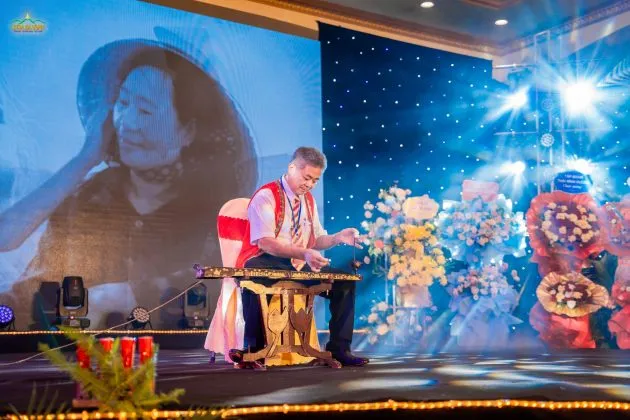 Nghệ sĩ ưu tú La Thăng – Hội đồng dòng họ Vũ – Võ tỉnh Thái Nguyên gảy đàn bầu thể hiện ca khúc “Lòng mẹ”.