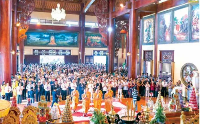 Thượng tọa Thích Trúc Thái Minh trụ trì chùa Ba Vàng tặng hoa chúc mừng.